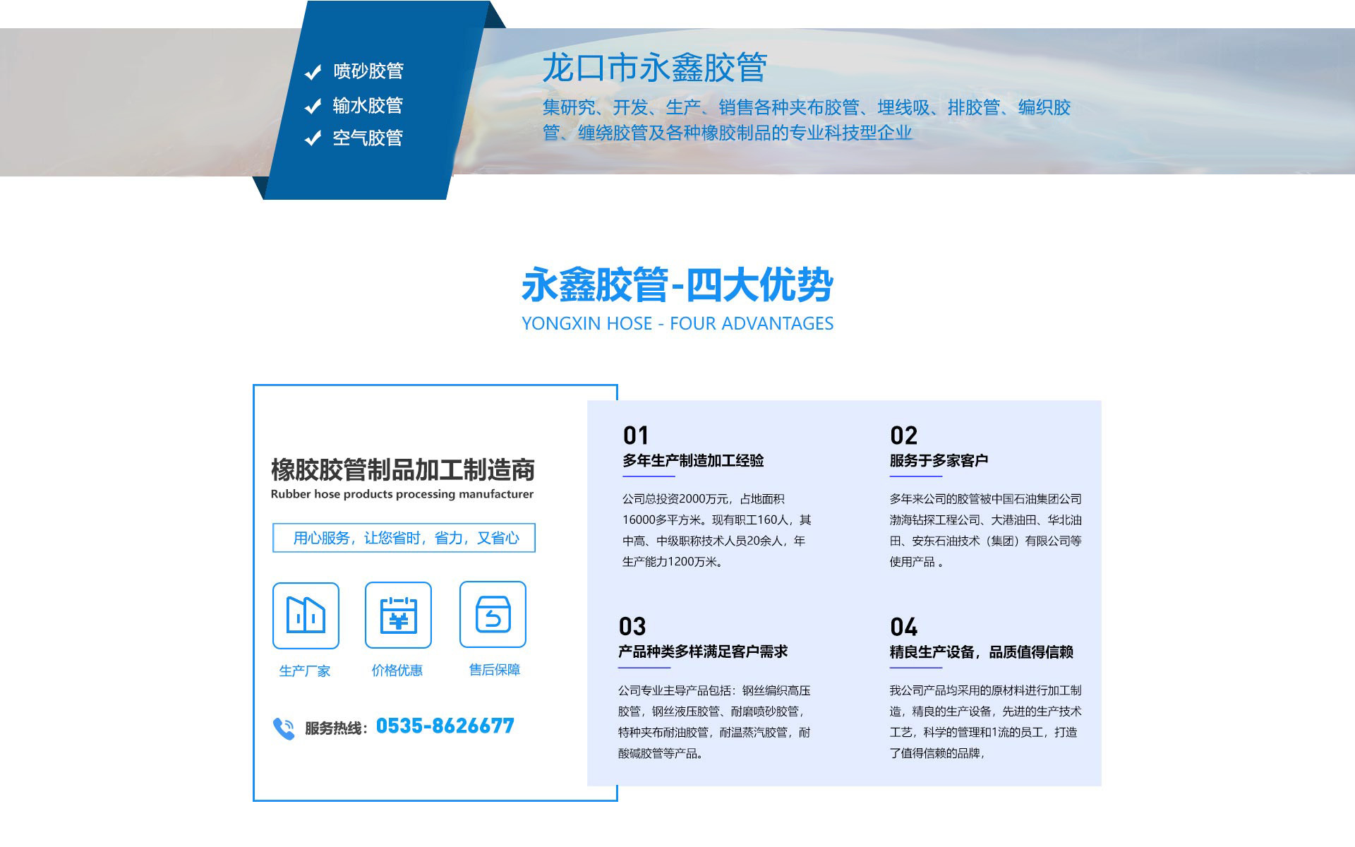 龍口市永鑫膠管有限公司始建于1979年。位于山東半島北端——龍口市,毗鄰龍口港、威烏高速公路和大萊龍鐵路,商業(yè)運輸,交通方便,地理位置好。公司總投資2000萬元,占地面積16000多平方米。現有職工160人,其中高、中級職稱技術人員20余人,年生產能力1200萬米。多年來公司的膠管被中國石油集團公司渤海鉆探工程公司、大港油田、華北油田、安東石油技術(集團)有限公司等使用產品我公司迎著十八界三中全會的改革大潮始終闊步向前,目前我公司主要從事高低壓橡膠軟管、鉆探膠管、夾布膠管、噴砂膠管、橡膠管帶制品,等產品的生產和研發(fā),主導產品包括:生產,研制高低壓橡膠軟管、輸送皮帶等以橡塑為主的產品,擁有各類進口,國產生產設備120多臺套,化驗,分析,試驗儀器設備種類多,檢測手段完善。我公司產品均采用的原材料進行加工制造,精良的生產設備和穩(wěn)定技術工藝,科學的管理,打造了客戶信任的牌子,先后與多家石油、化工、汽車制造等大型國有企...